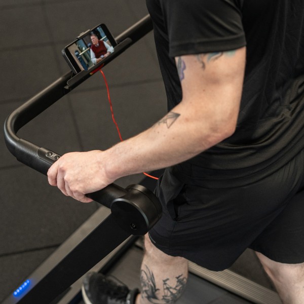 The BodyMax TM10 fitness equipment includes hot keys for speed adjustment, a phone holder, hand pulse sensors, a safety lock function for emergency stop, and an optional laptop tray*.